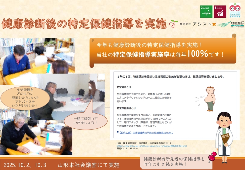 健康診断後の特定保健指導を実施 健康経営 2025.10.06 今年度も例年どおり、健康診断後の特定保健指導を実施しました。 保健師さんによる面談では、個人の健康状態や生活習慣に応じた具体的な食事・運動等のアドバイスを受けることができ、 参加者からは「実践的でわかりやすかった」「生活改善のきっかけになった」といった声が寄せられました。 お知らせ一覧へ