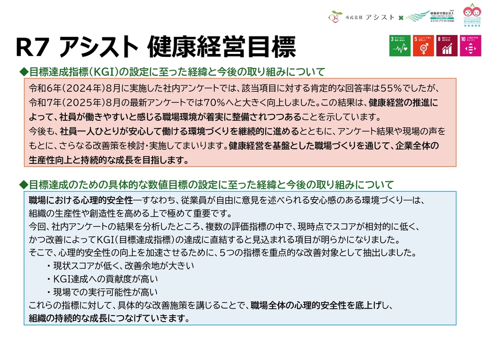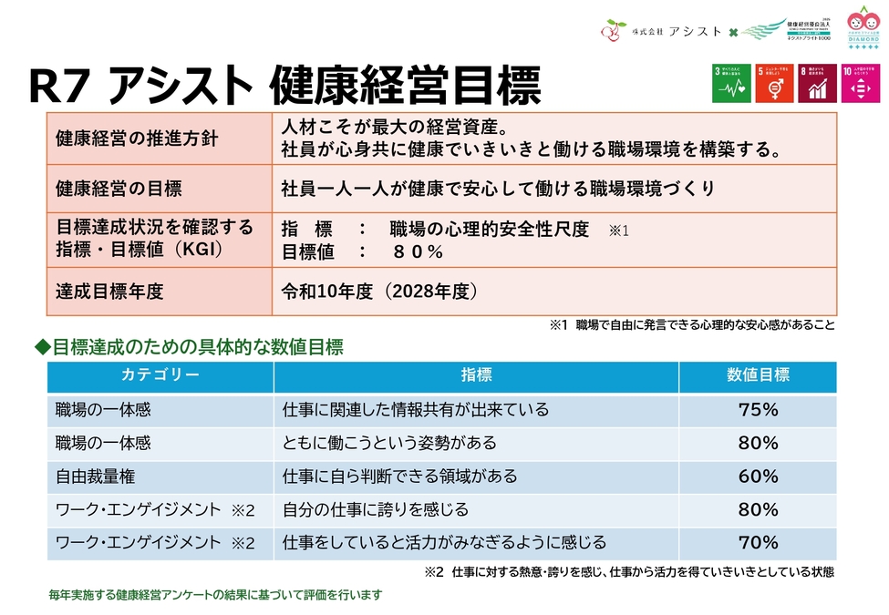 令和7年度 健康経営目標 健康経営 2025.10.08 毎年、全社員を対象に実施している健康経営アンケートの結果を踏まえ、 今年度の健康経営における数値目標を新たに設定いたしました。 健康診断に基づく身体的指標や生活習慣に関する改善目標の達成はもとより、 社員一人ひとりが心身ともに健やかに、いきいきと働ける職場環境の整備に向けた取り組みをさらに強化してまいります。 お知らせ一覧へ