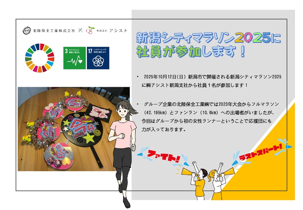 新潟シティマラソン2025に社員が参加します! 健康経営 2025.10.10 令和7年10月12日(日)に開催される新潟シティマラソン2025に弊社社員1名が参加します! 新潟県のにいがた健康経営推進企業として令和6年度に「グッド!スポーツカンパニー賞」、 令和7年度は「知事賞」を受賞しているグループ企業の北陸保全工業株式会社とともに応援してまいります! 〈新潟シティマラソン2025〉今年は11名が参戦☆サポーター企業として応援します! | 北陸保全工業株式会社 お知らせ一覧へ