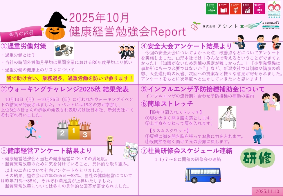 2025年10月 健康経営勉強会・全体会議レポート 健康経営 2025.11.10 10/24に山形本社と新潟支社で健康経営勉強会と全体会議を開催しました。 健康経営勉強会は都合により書面回覧となりました。 全体会議では、今月も各部署から多くの提案や情報共有・報告がありました。 今月の健康経営話題提供は「オイルファースト」についての発表でした。 お知らせ一覧へ