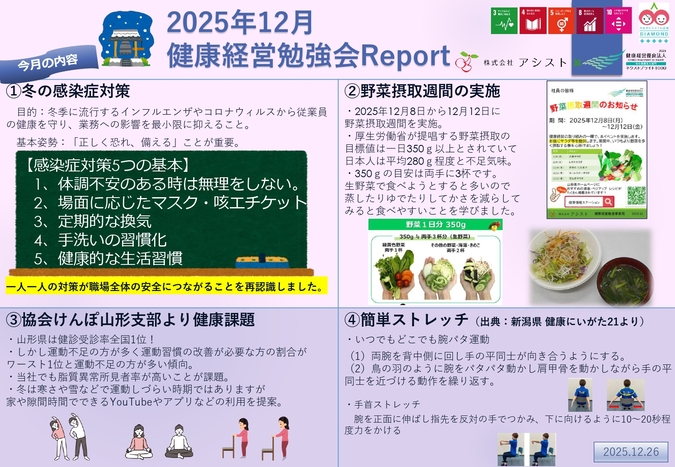 2025年12月 健康経営勉強会・全体会議レポート 健康経営 2026.01.19 12/26に山形本社と新潟支社で健康経営勉強会と全体会議を開催しました。 全体会議では、今月も各部署から多くの提案や情報共有・報告がありました。 今月の健康経営話題提供は「私のたばこをやめた時の体験談」でした。 お知らせ一覧へ