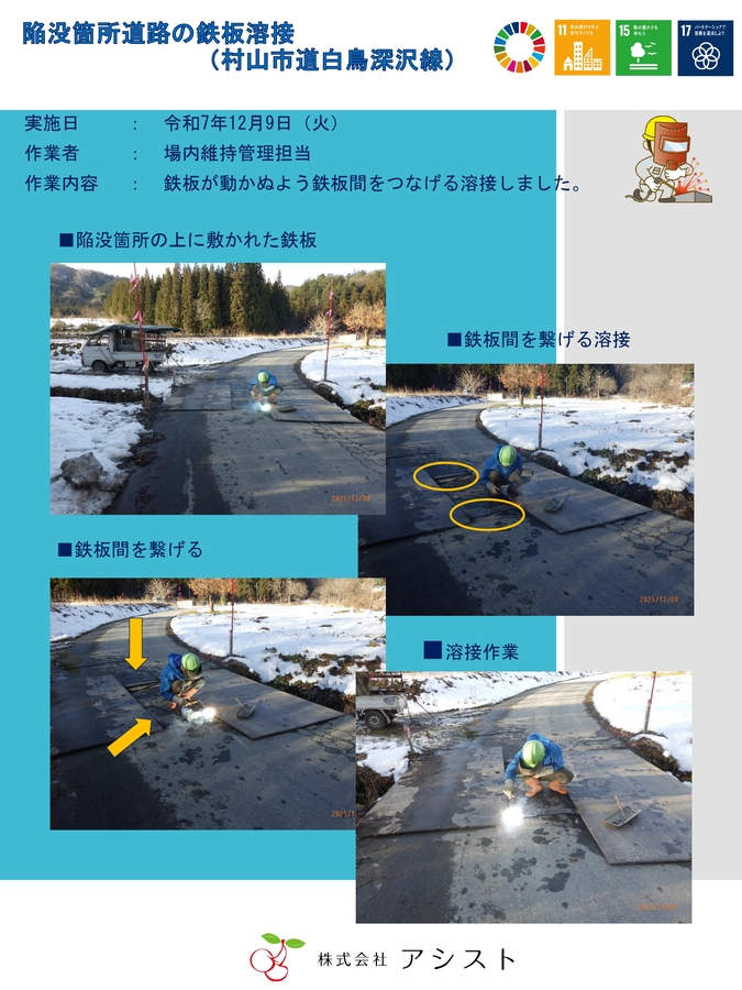 陥没箇所道路の鉄板溶接(村山市道白鳥深沢線) SDGs 2026.01.29 鉄板道路(市道白鳥深沢線)の陥没箇所に敷いた鉄板を固定する為、 鉄板間を繋げる溶接をいたしました。 車両が安全に走行できるよう、維持活動を引き続き行ってまいります。 お知らせ一覧へ
