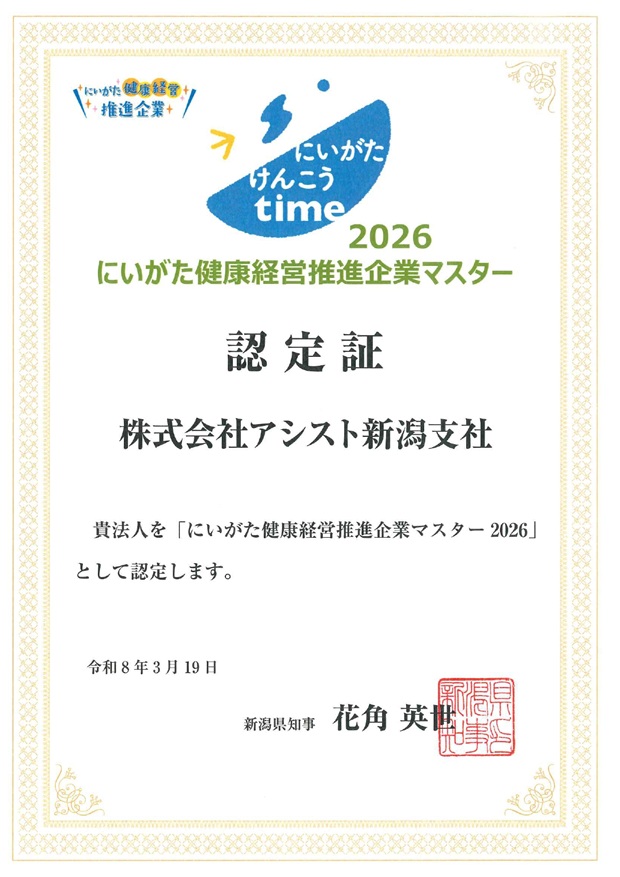 にいがた健康経営推進企業マスター2026に認定いただきました! 健康経営 2026.04.06 弊社の新潟支社は、一昨年・昨年に引き続き 「にいがた健康経営推進企業2026マスター」に認定いただきました! ※認定基準 「にいがた健康経営推進企業」の中から「取組状況報告書において優れた企業」として 優良な上位100社を上限として「にいがた健康経営推進企業マスター」の冠を付加して認定する。 3年連続でマスター認定をいただけたことは大変喜ばしいことです。 今後も働く世代の健康づくりに積極的に取り組んでまいります。 お知らせ一覧へ